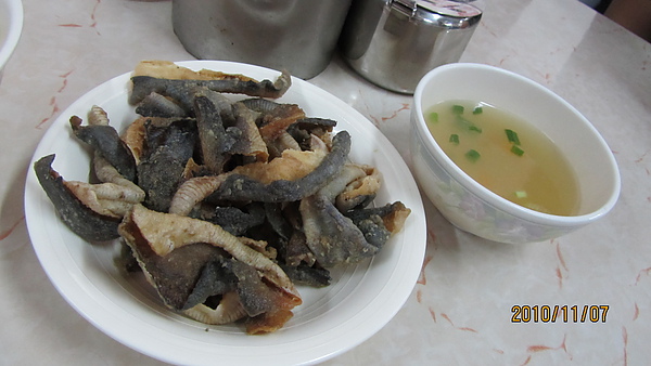 這個炸魚皮很硬,所以要先在旁邊的湯裡面浸一下才有辦法吃下去。